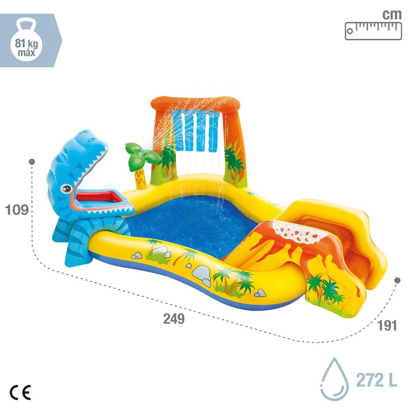 • Inflatable dinosaur play center will have kids playing and splashing in the swimming pool or sliding down the volcano water slide, offering hours of entertainment and enjoyment