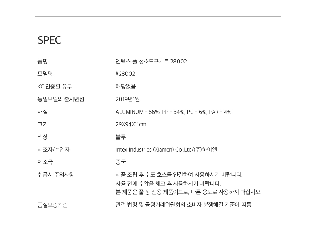 - Product name and model name: Intex Pool Cleaning Tool Set 28002
