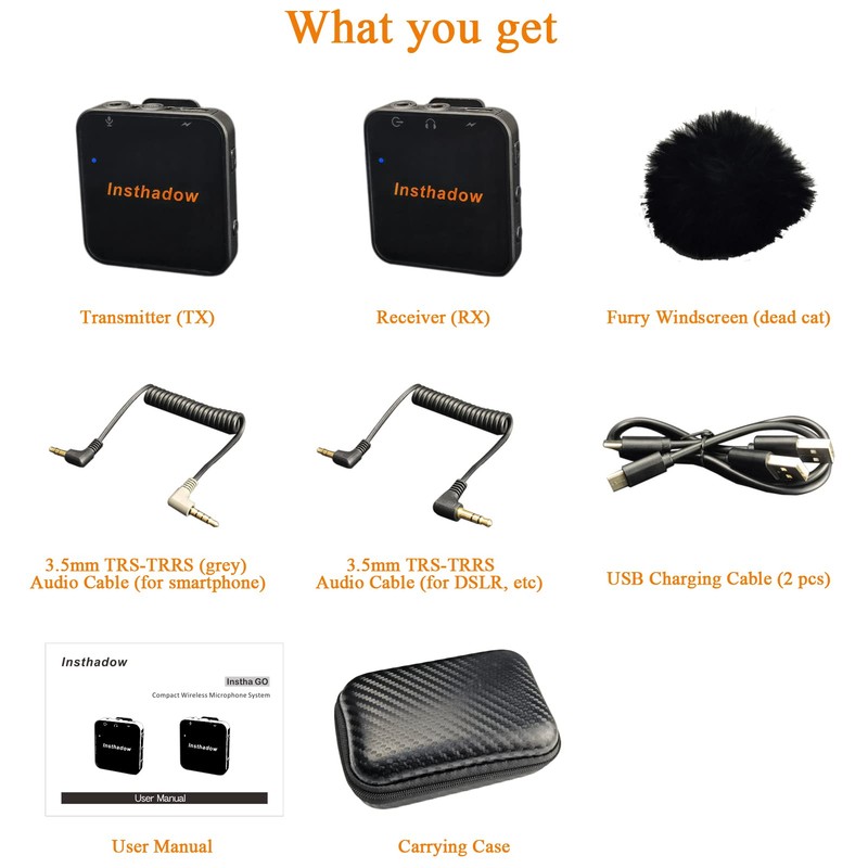 - ★ What You Get: What You Get: Transmistter*1 / Receiver*1/ 3.5mm TRS Cable / 3.5mm TRRS Cable*1 / USB Cable*1 / Furry Windscreen*1 / User Manual*1