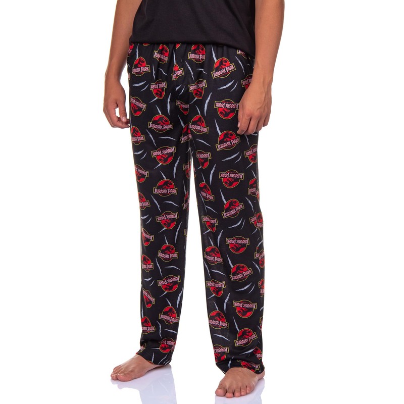 - Coordinated Pants: The pants feature an all-over print with repeating Jurassic Park logos and claw slashes, tying back to the design of the top for a cohesive set. The black background helps the bright elements pop, giving these pajama bottoms a bold and energetic visual appeal