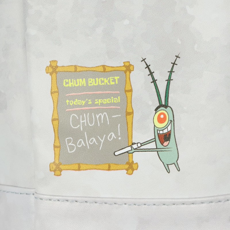 - Character Tie-In: Styled After the Chum Bucket Restaurant: This lunch tote draws inspiration from Plankton’s Chum Bucket restaurant across from the Krusty Krab in Bikini Bottom. The bucket-style shape and front detailing reflect the animated look of the structure, while a smaller print on the back reads “Chum Bucket Today’s Special: Chum-balaya.” A fun choice for SpongeBob fans of all ages.