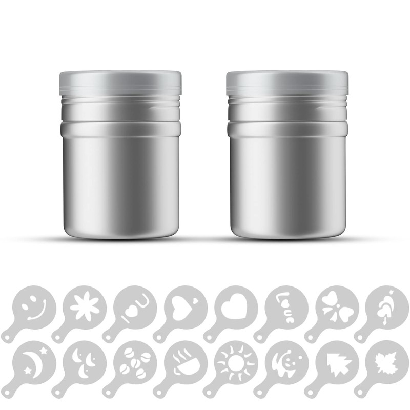 Intirilife 18-Piece Set Powder Shakers, 5 x 7 cm, 2 Powder Shakers with 16 Different Stencils in Silver, White, for Decorating and Dusting Baked Goods, Coffee and Similar Items