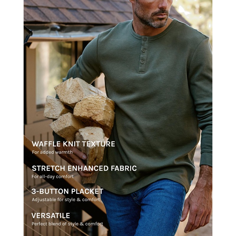 Our waffle shirts for men features a classic 3-button henley placket to elevate your look. The waffle knit texture of this mens thermal shirt improves the warmth and style of your look. Our cotton blend henley shirts for men are crafted with a stretch-infused fabric for ease of movement. The reinforced stitching enhances your mens long sleeve henley's durability for many years to come.