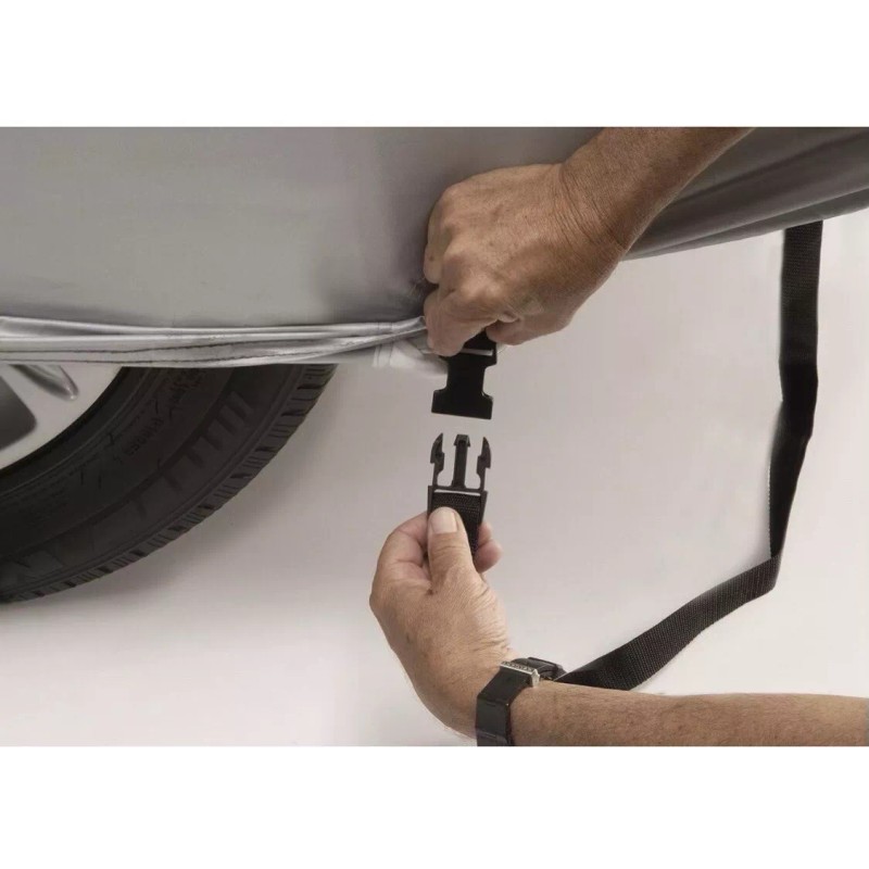 Intro-Guard™ Silver Custom fit Car Cover by Intro-Tech comes with Mirror Pockets for a snug fit. Also includes Adjustable Nylon straps with buckles to secure your custom fit cover stays tight and secure to your vehicle. This prevents wind flapping and excessive wear on the fabric as well as rubbing against your paint job! The cover features a center pocket grommet to use as extra security to be able to lock your cover. Locks are sold separately! Intro-Tech Automotive®. Is a Full Custom Car Cover manufactured for a custom fit using a superior quality 150 Denier woven polyester fabric which is Intro-Guard coated with an aluminized polyurethane acrylic. Soft and non-abrasive to clear coat finishes, it is an extremely lightweight and highly protective full car cover. Nearly waterproof, yet breathable; it will not absorb water like most perforated fabrics. The others you see online are cheap inferior knock offs that sell for 1/2 of what the Intro covers sell for and do not last. Get the original that Goes on easy and removes in seconds, comes with a storage bag too. These are the same ones sold at the car dealerships for about $200.00!!
