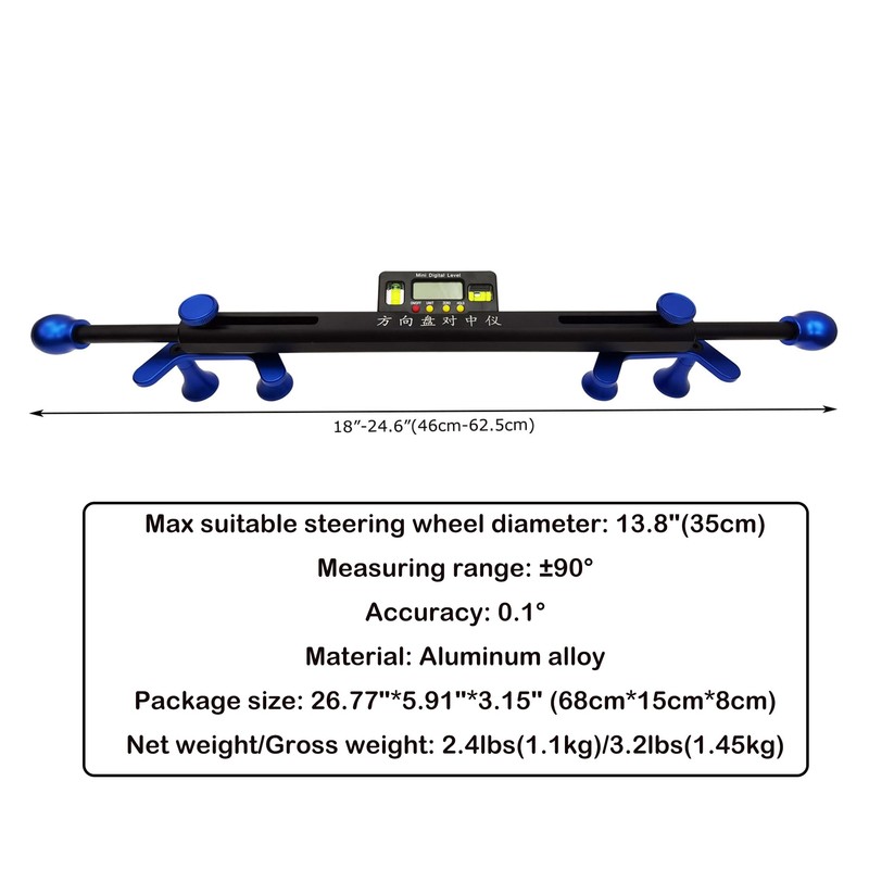 - Product Parameters: Max suitable steering wheel diameter:13.8"(35cm), Measuring range:±90°, Accuracy:0.1°, Material:Aluminum alloy