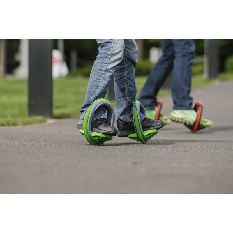 The Orbitwheel is a new concept for wheeled sports and the idea is simple: two feet, two wheels…and you’re ready to go! A set of Orbitwheels is a cross between a skateboard and pair of inline skates - but with more freedom and simplicity than either. When you're ready to ride, simply put your foot in the wheel and away you’ll go. The wheels' large radii allow you to ride on a variety of different surfaces, and an all-new connecting band makes learning easier than ever! After you have mastered the wave-like propulsion, you can remove the band for amazing freedom of movement. With the Orbitwheels whirling around your feet, you’re capable of countless tricks and maneuvers that can be as complex and creative as your imagination! The Orbitwheel is, in a nutshell, a large wheel that rotates sideways around your foot. Better than skateboards, Orbitwheels are self-propelled by the rider's wave-like motion so the need to push off the ground every few feet to get moving is completely eliminated.
