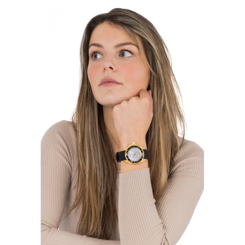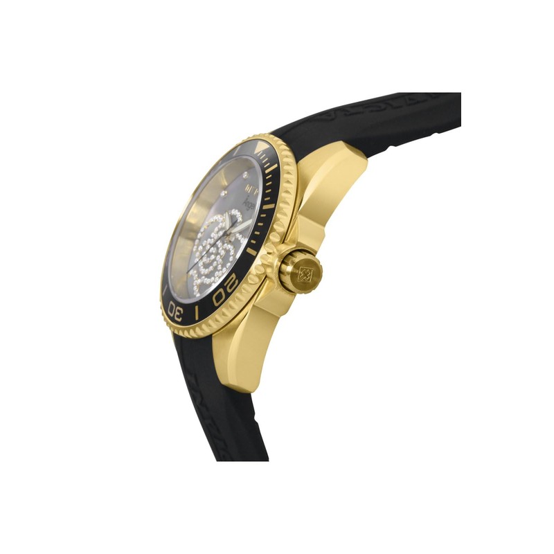 - White mother-of-pearl dial with luminous gold-tone hands and 12 cubic zirconia hour markers; gold-tone and cz design on dial; black unidirectional bezel