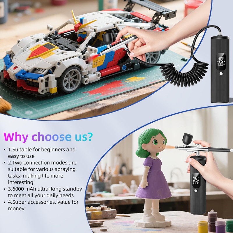 - High Pressure Spray Flow: Airbrush kits featuring 48PSI air pressure and airflow reaching 15L , Upgraded 6000 mAh battery for 100% more standby timeresulting in a 90% performance boost. Suitable for a variety of uses, such as art painting, model coloring, cake decorating, nail art, make-up, beauty and so on