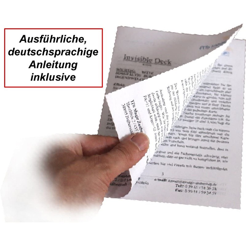 - Bicycle deck and German instructions - The Invisible Deck in Bicycle quality includes detailed German language instructions from the It’s Magic shop, which leaves no questions unanswered!