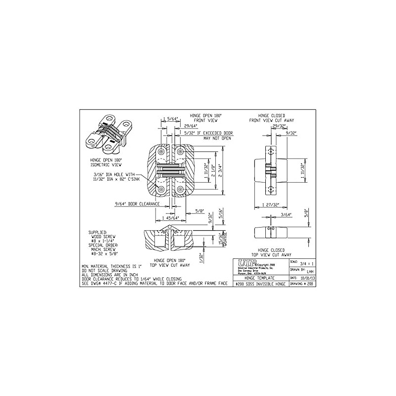 #208 SOSS invisible hinge for 1" to 1-1/8" thick material, zinc hinge bodies, steel and nylon links, opens 180 degrees.