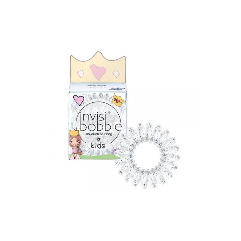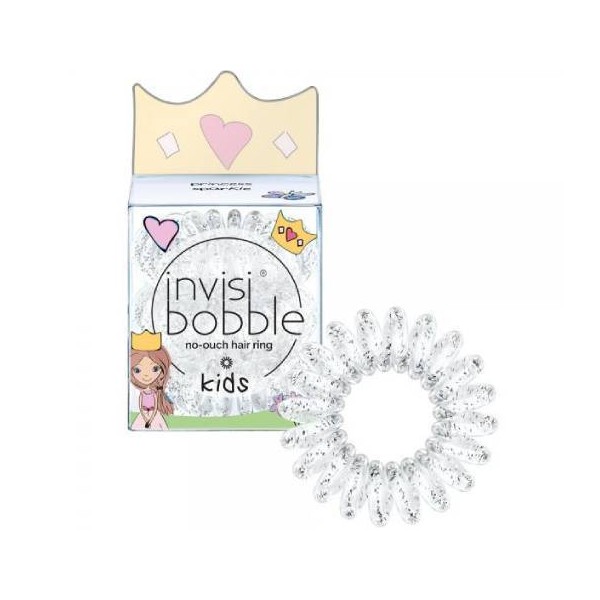 Create space buns or cute braids with the Kids' invisibobble Hair Tie in 'Princess Sparkle' The revolutionary hair tie is perfect for creating an array of up-dos without the 'ouch'. Ideal for holding hair in place without clips or pins, the glittery bobble is made from an ultra-flexible coil with a comfortable shape to help prevent headaches and kinks. The non-soaking design and smooth surface means it will keep dry no matter what, helping to prevent tangles, breakage and split ends caused by snagging. Anti-allergic. Includes 3 x hair ties.