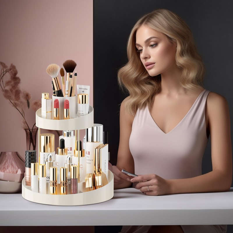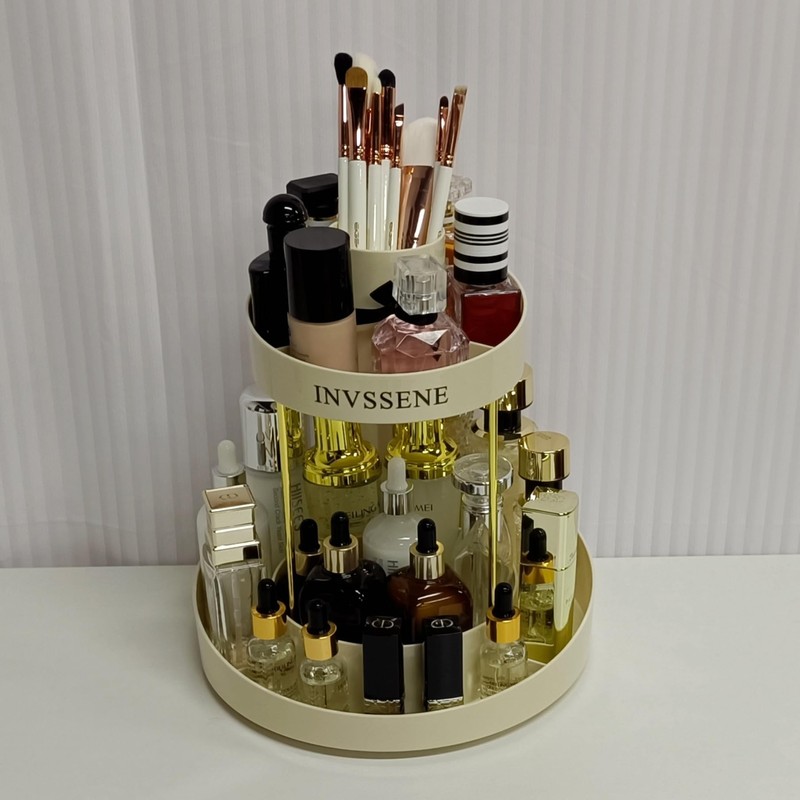 INVSSENE 2 Tiers Rotating Makeup Organizer, Large Makeup Organizer for Vanity, Countertop Storage Shelf for Cosmetics, Skincare, Makeup Brush - Warm White