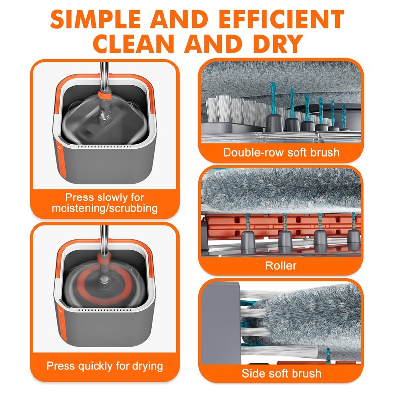 • Thorough Cleaning of Mop Pads: The spin mop features double rows of brushes at the bottom along with side spray ports to thoroughly clean both sides of square mop pads effortlessly. A widened filling port makes adding water and cleaners easy, preventing spills or residue.