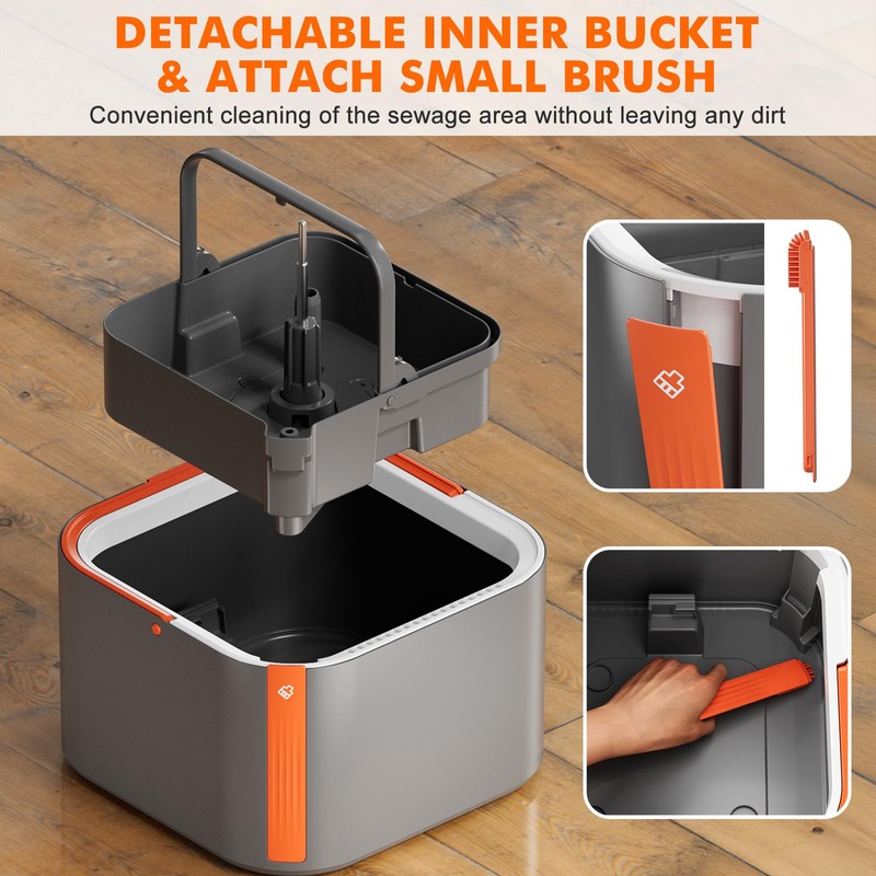 • Detachable Inner Bucket: The inner bucket of the spin mop set separates easily from the outer bucket for quick cleaning. It includes a hidden silicone brush for efficiently cleaning the bottom edge without dirtying your hands. The upgraded drain plug is secure and prevents spills.