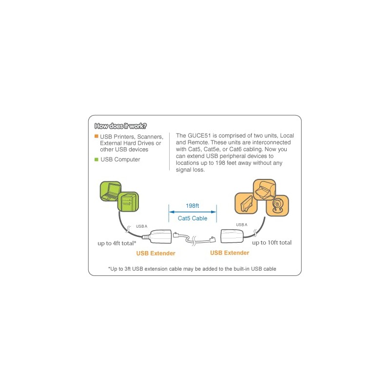 • Utilice cables Cat5, Cat5e o Cat6 RJ / 45 para extender sus periféricos USB hasta 198 pies de distancia