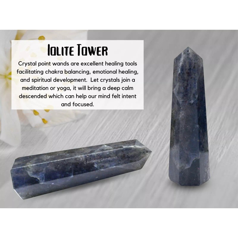 - Iolite Crystal Tower will uplift and purify the energy (if its point is not damaged), so you can place it in any area that needs to be re-energized with strong energy. Length of this tower / wand / obelisk / point is 2" inch to 3" inch (5cm to 7.5cm) & width is 0.75 inch (2 cm).