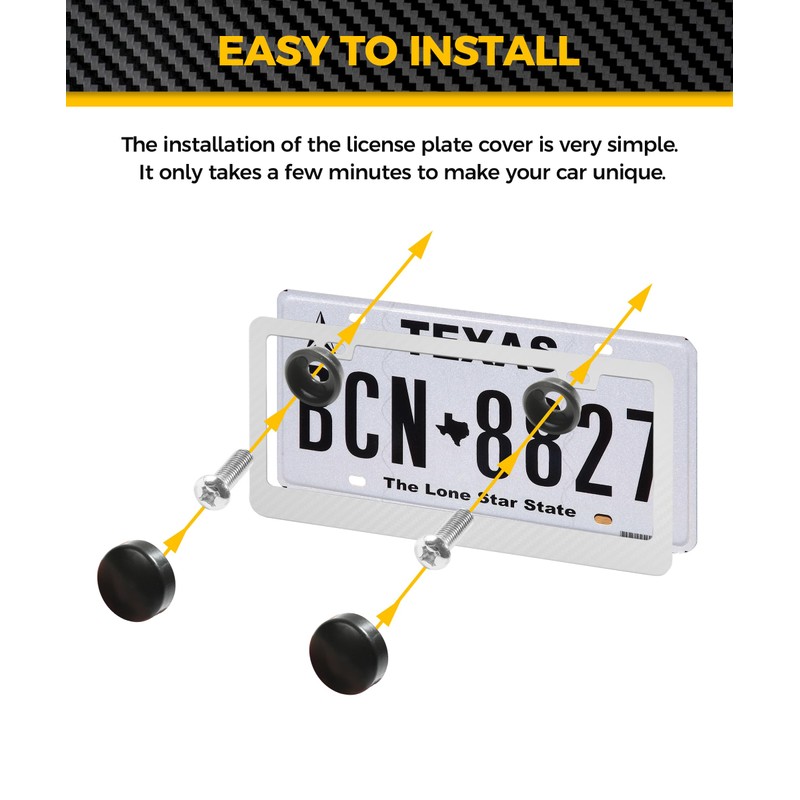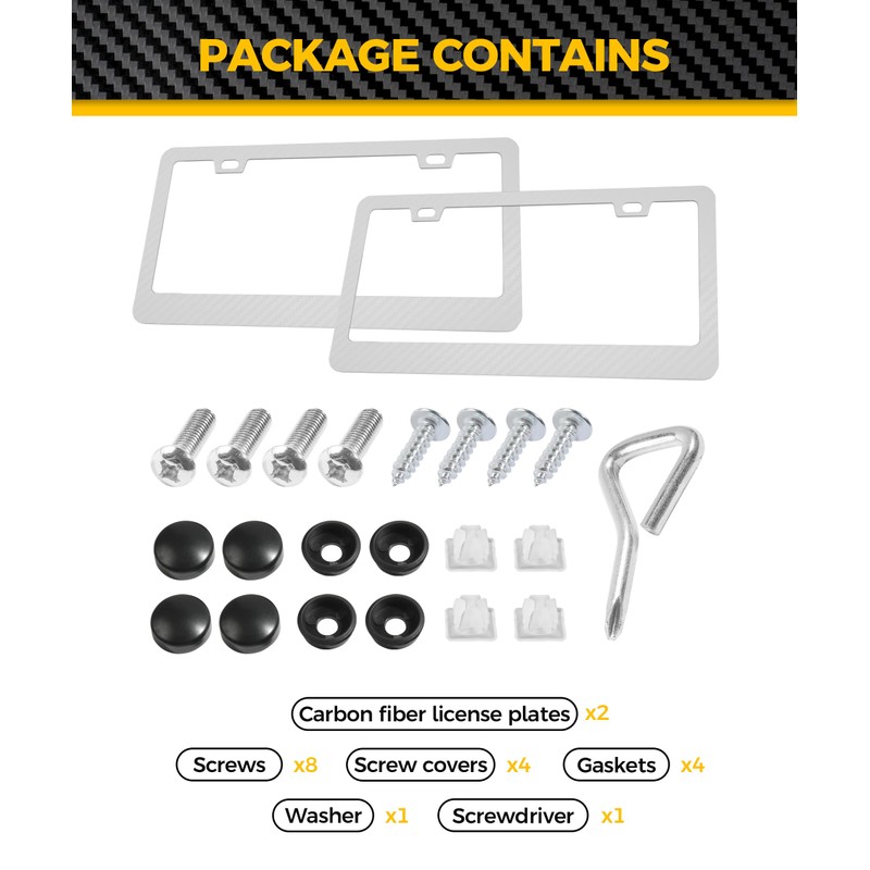 • [Widely Applicable]: The package includes 2 license plate frames, 4 pieces of screw covers, 4 pieces of metal screws, 4 pieces of washers, 1 piece of screwdriver. The size of the license plate frame is 12.4×6.3 inches, 5mm thick, suitable for most standard-sized US license plates.