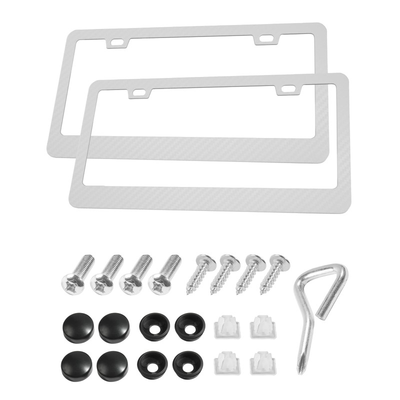 Material: Stainless steel and aluminum alloy< br > Size: 12.4×6.3 inches, 5mm thick< br > Color: black, white< br > < br > What is included in the box?< br > -2x license plate frame< br > -4x screw cover< br > -4x Metal Screws< br > -4x washers< br > -1x screwdriver< br > < br > Our Product Advantages< br > - Material: Made of high quality stainless steel and aluminum alloy. Rugged and durable, wear-resistant< br > - Features: Can protect license plates and effectively prevent aging and fading. Stabilize license plate position< br > - Advantages: Simple and classic design gives your car an elegant appearance< br > - Installation: Easy to install, easy installation and removal of license plate frames in minutes< br > - Applicable: Suitable for most standard sizes of US license plates< br >