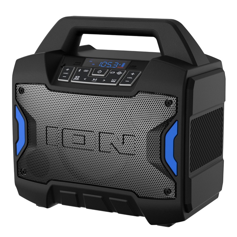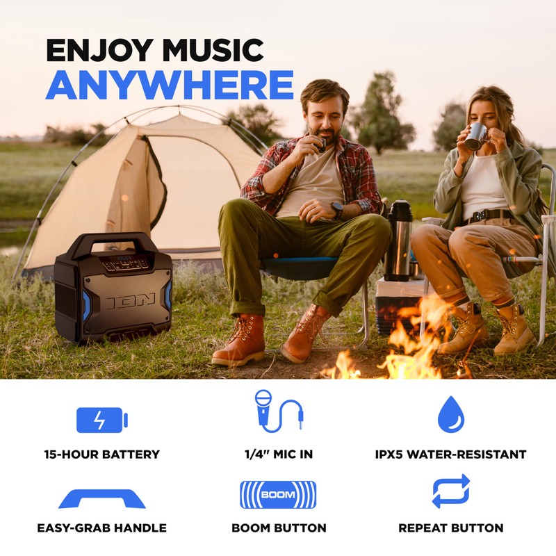 ION Tailgater Boom - Outdoor Portable Bluetooth Speaker with Mic in, FM Radio, USB Port, Battery, IPX5 Water-Resistant, Wireless Stereo-Link, App, 60W