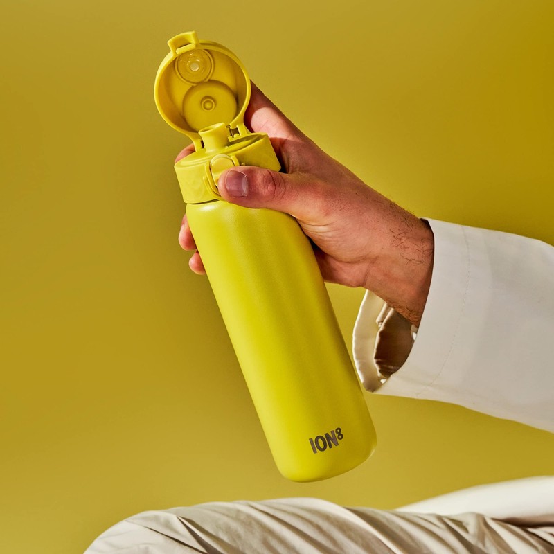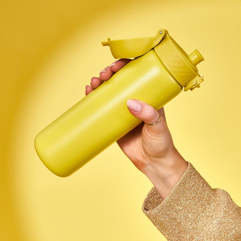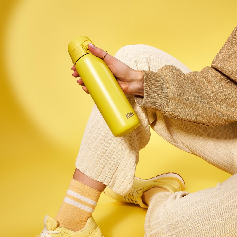ION8 Vacuum Insulated Steel Water Bottle, 500 ml/18 oz, Leak Proof, Easy to Open, Secure Lock, Dishwasher Safe, Fits Cup Holders, Carry Handle, Scratch Resistant, Metal Water Bottle, Yellow