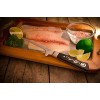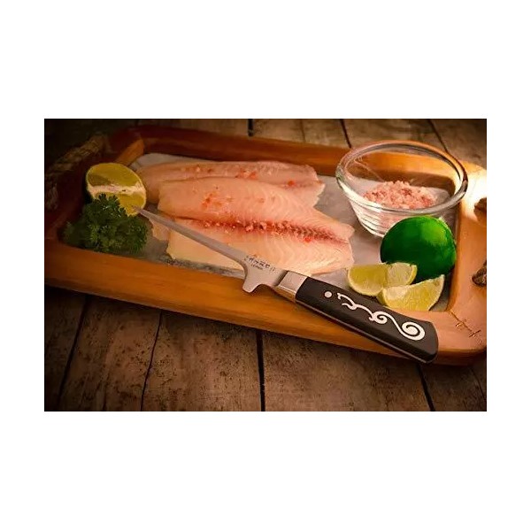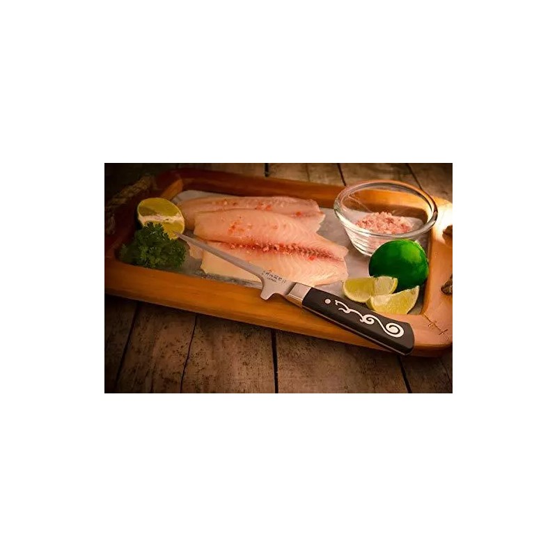 Features: • A Japanese twist on I.O.Shen's beloved boning knife • A slim pointed blade It has a narrow blade with tapered tip which makes it much easier to work around bones • TRIPLEX TECHNOLOGY - ERDON 62° PREMIUM HARD STEEL, sandwiched between two layers of softer stainless steel (ERDON 10°) to produce the ultimate cutting edge • Handcrafted in average 7 hours by our knife’s master attained to 15° angle edge, mirror finished cutting edge, hand polished • The Tai Tang handle is not just an embellishment but it is actually an integral part of the handle frame (the Tang) A stiletto boning knife with an inverted handle for a comfy holding position. A fine blade with a small surface area allows free movement and less resistance. Designed by Chef Karim Maoui It's the perfect shape for intricate butchery. The inverted mid sized handle makes it a comfortable fit, easing the pressure on your palm Item # 4130