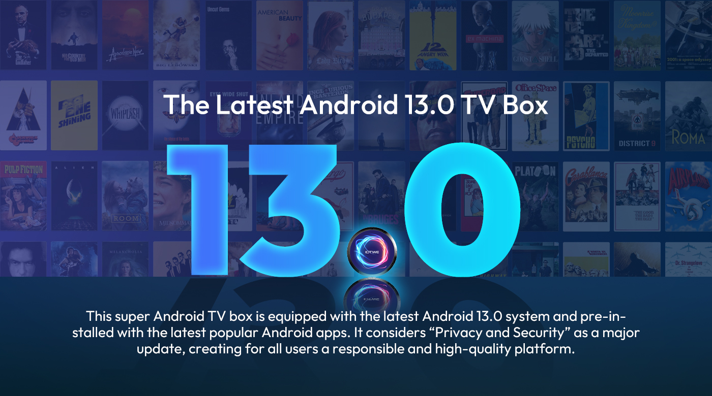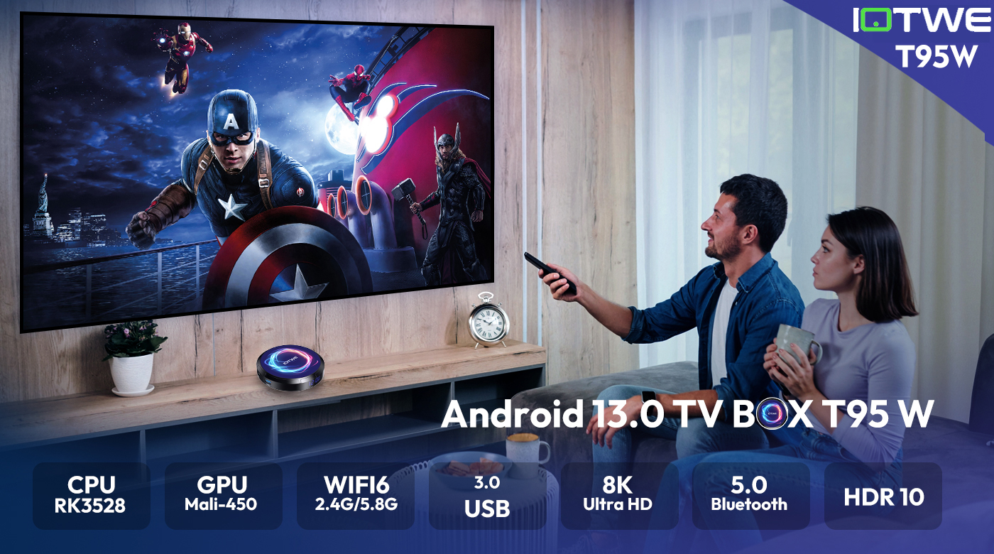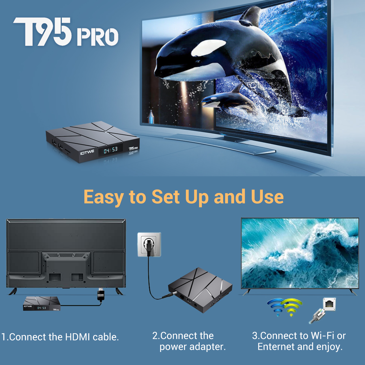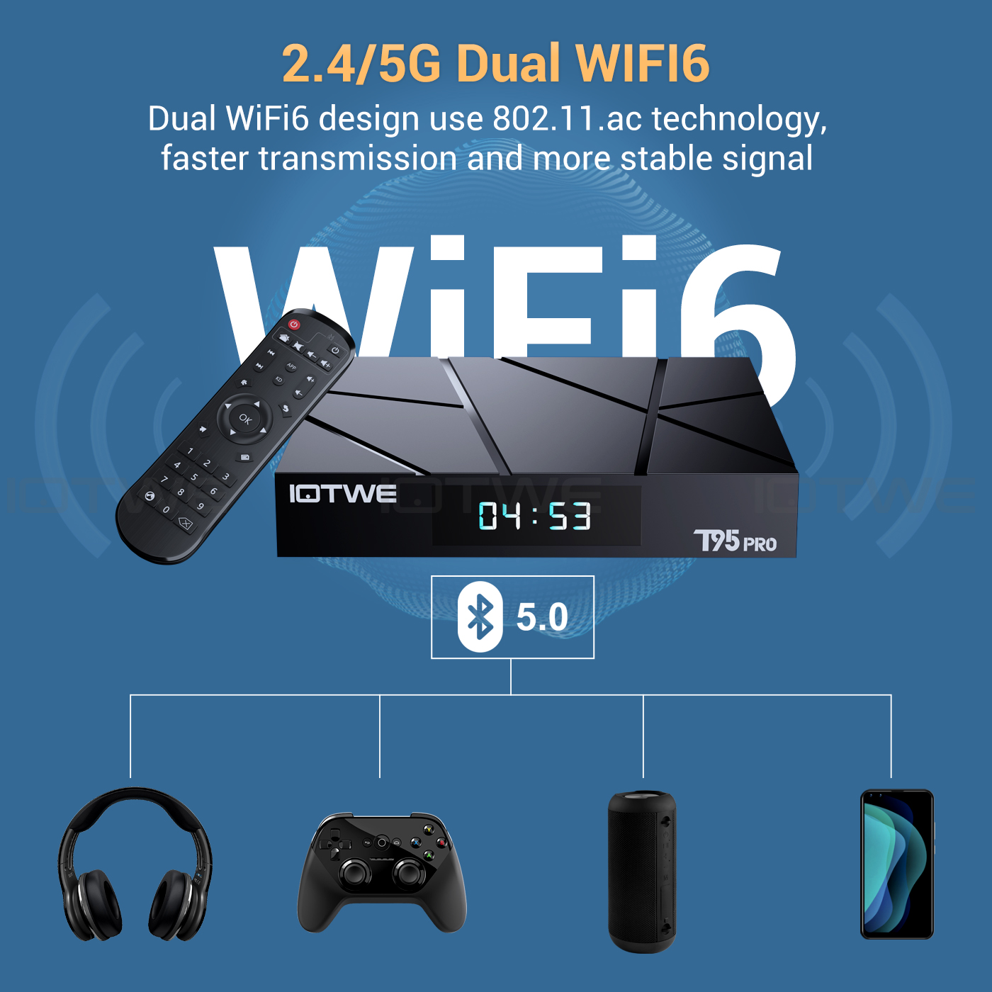 • The T95 W Smart TV Box with Android 13.0 OS offers you an improved operating system compared to Android 12.0. Enjoy the benefits of a faster, more stable system, improved software compatibility, and a streamlined user interface and experience. Experience better games, applications and overall improved performance with the T95 W Android 13.0 TV Box.