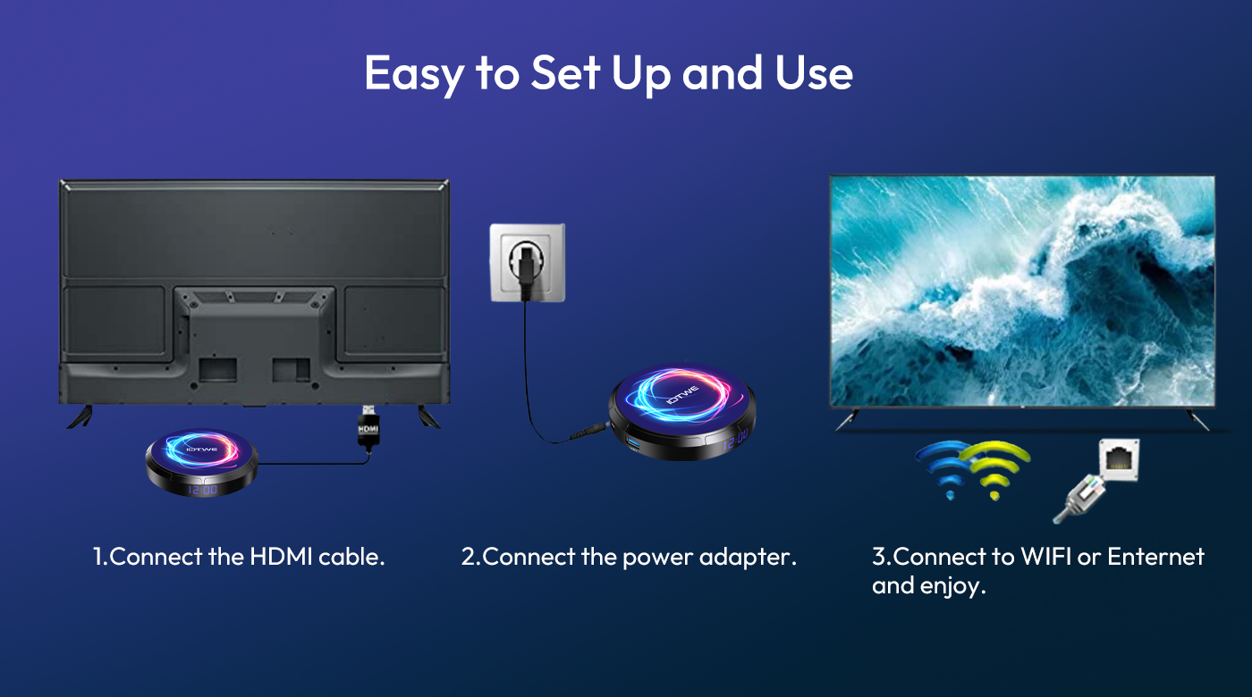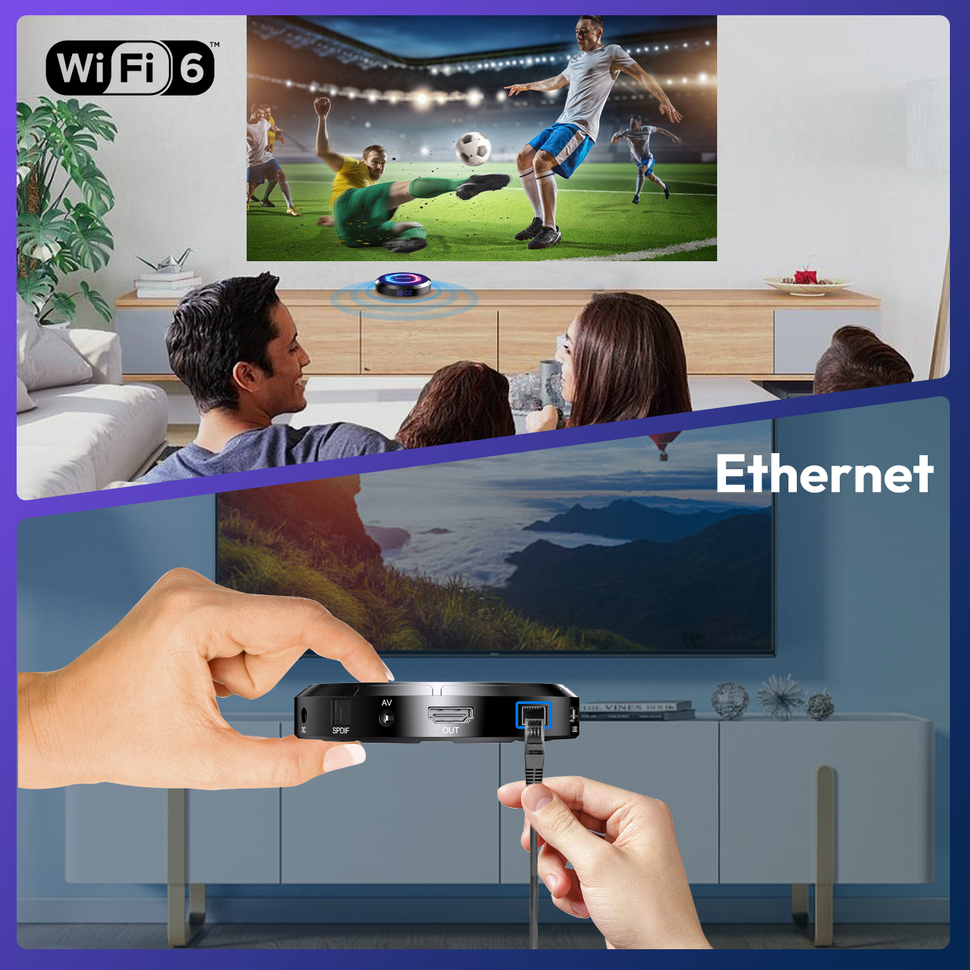 • The TV box powered by Android 13.0 supports 2.4G/5G WiFi 6 and BT 5.0, which makes using a mini keyboard and headphones more convenient. With WiFi 6 you can benefit from up to 12 simultaneous data streams in the 2.4GHz and 5GHz bands, compared to the 8 streams WiFi 5 offers in a dual-band configuration. Use the app and watch movies. All you have to do is plug the network cable into the appropriate socket and you're ready to go.