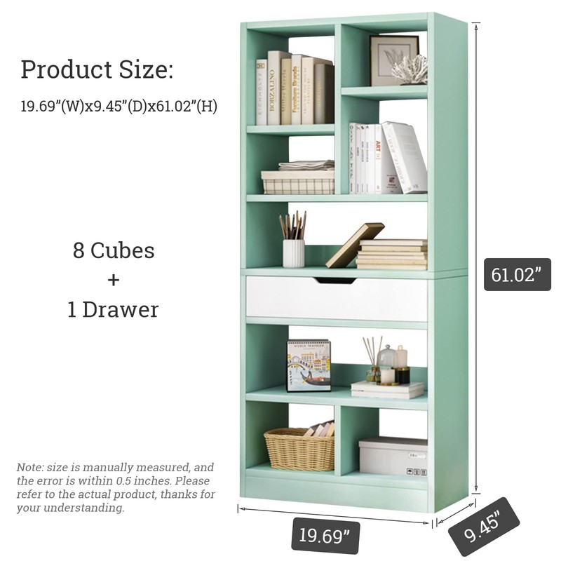 IOTXY Wooden Open Shelf Bookcase - 61 Inches Height Freestanding Display Storage Cabinet Organizer with 8 Cubes and a Drawer, Floor Standing Bookshelf in Tiffany-Green