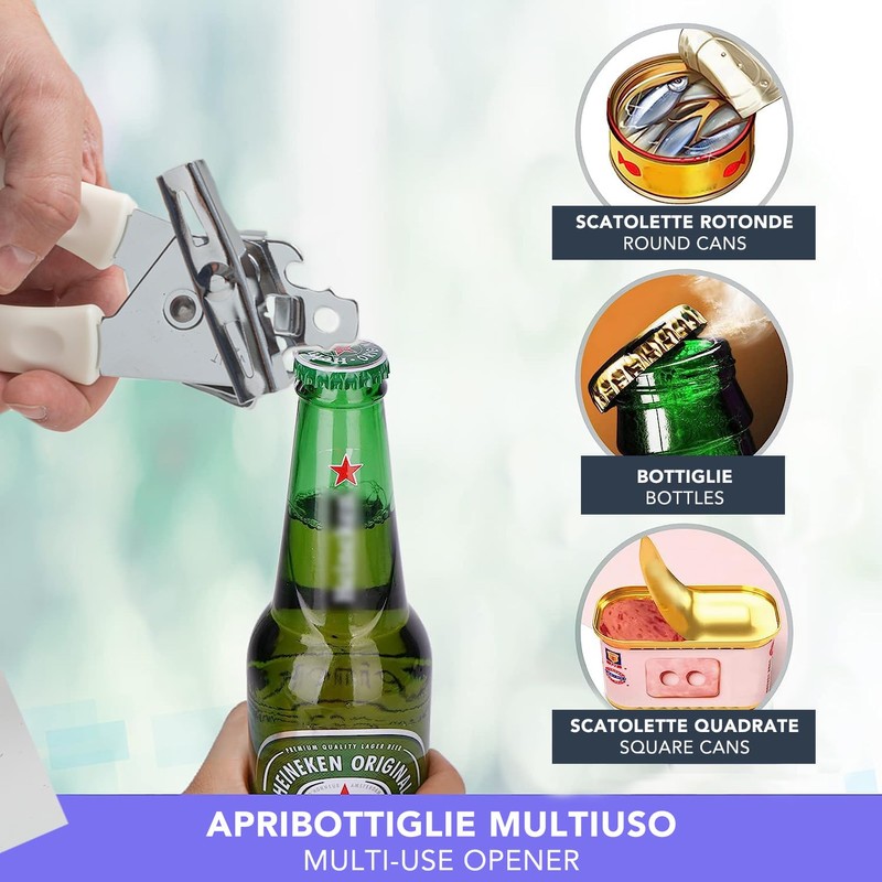 - MULTIPURPOSE The can opener is suitable for opening various kinds of cans, such as food, drinks and canned food. It is a versatile and practical tool for the kitchen or in any other situation where you need to open cans easily and safely. Also with bottle opener for opening bottles with metal caps.