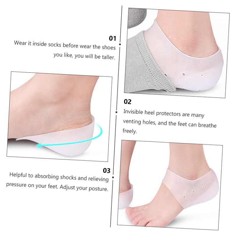 Heel Lift Insole Unique U shape design of invisible insoles make you comfortable to wear.Increase Lifting Socks No moving and slipping. Insole And there are many venting holes on heel protectors for helping your feet breath freely.Insole with Heel Protective Cover Wear them inside socks before wear the shoes you like, you will be taller.Foot Protection Pad Made of with fine workmanship, our invisible heighten insole and heel protector with holes must be greatly beneficial for you.Inner Height Insoles No on your feet for long time walking or standing