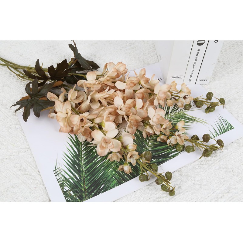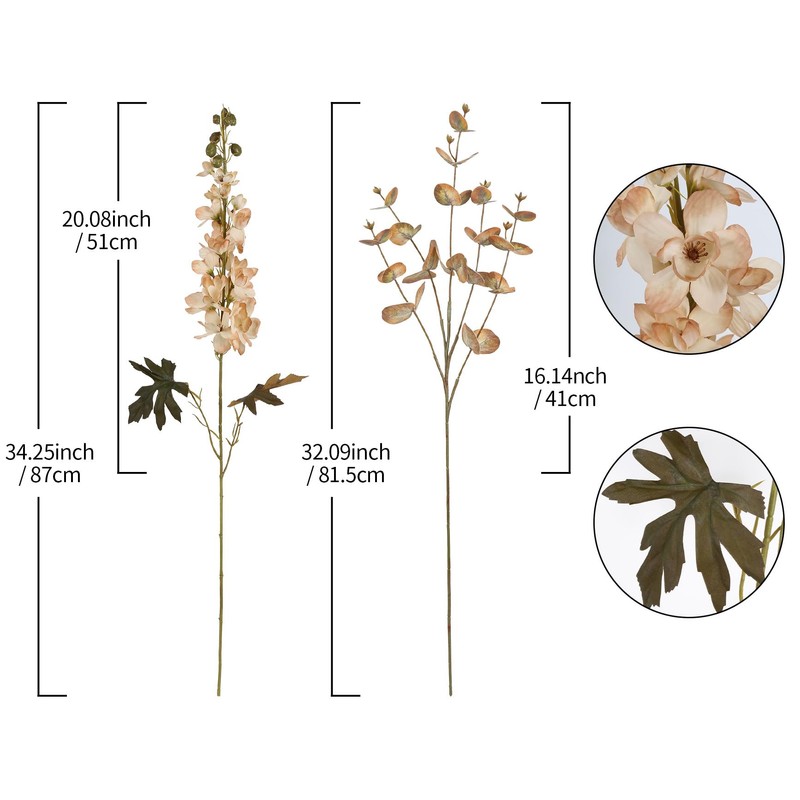 • Size and Package: IPOPU fake flowers box set include: light brown delphinium artificial flowers 3pcs + 2pcs brown eucalyptus stems, the artificial delphinium flowers is total approx. 34.25”/ 87cm height, the larkspur flower with leaves part height size 20"/51cm, the fake eucalyptus is 32.09"/81.5cm length, the tall fake flowers combo is great for your long stem artificial flowers for tall vase floral arrangements