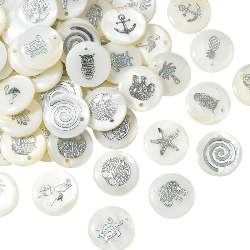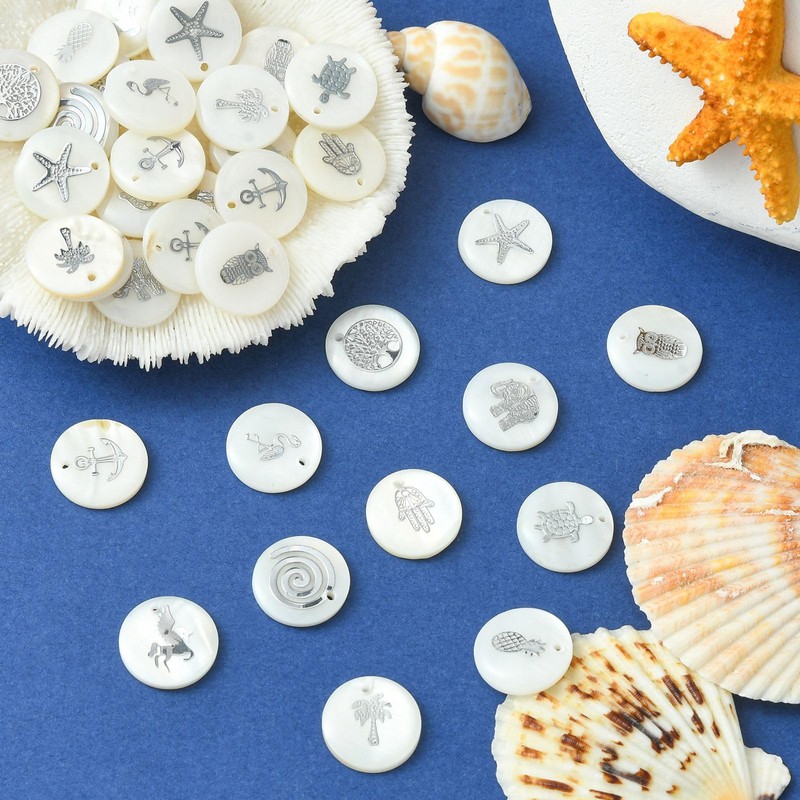- ❤Material: These pretty flat round with patterns charms pendants are made of freshwater shell with white color and great texture, very sturdy and reliable, not easy to fade or break, bring you a comfortable wearing experience.