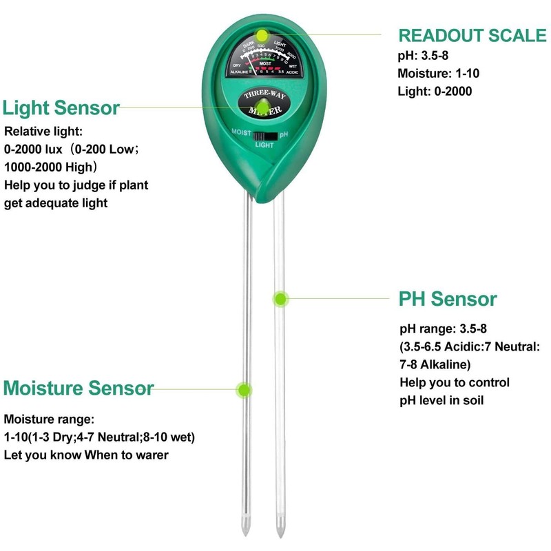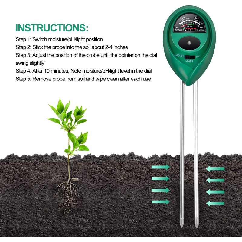 - Promote Plant Growth Healthy: The 3 in 1 soil meter help you adjust your plant soil's moisture, pH, and light levels according to the test result to achieve optimal plant growth.