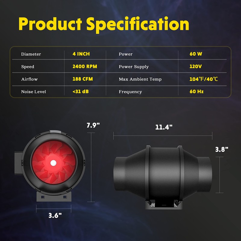 - Note: max ambient temp is 104℉/40℃. Package included: 1 pack 4 inch inline duct fan with speed controller