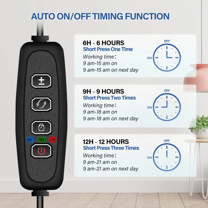 - Auto Turn On/Off Timer Function: Set up once, the plant grow light will turn on and turn off automatically at the same time every day for 6/9/12 hours