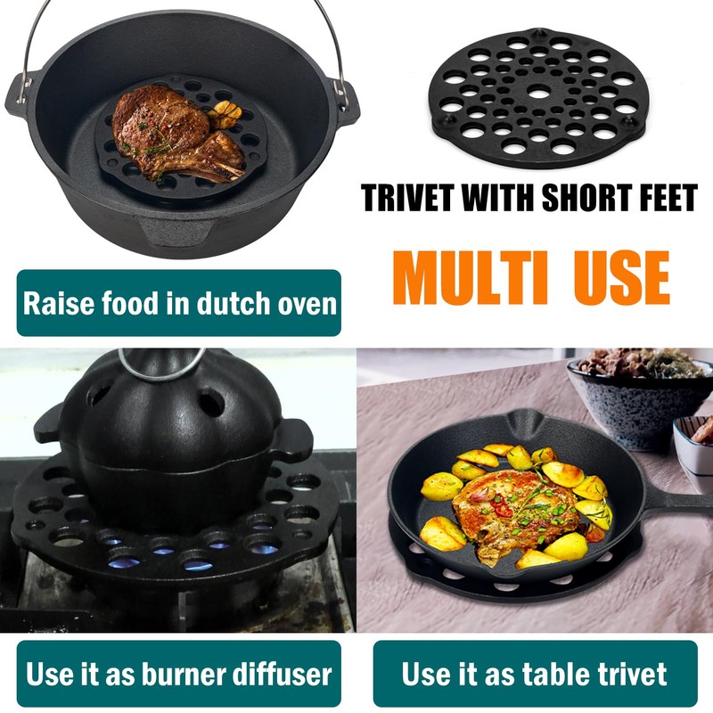 - Raises meats, sourdough bread, pies, and other foods off pan bottom to prevent scorching in dutch ovens. Fit for 4 quarts cast iron dutch ovens or larger