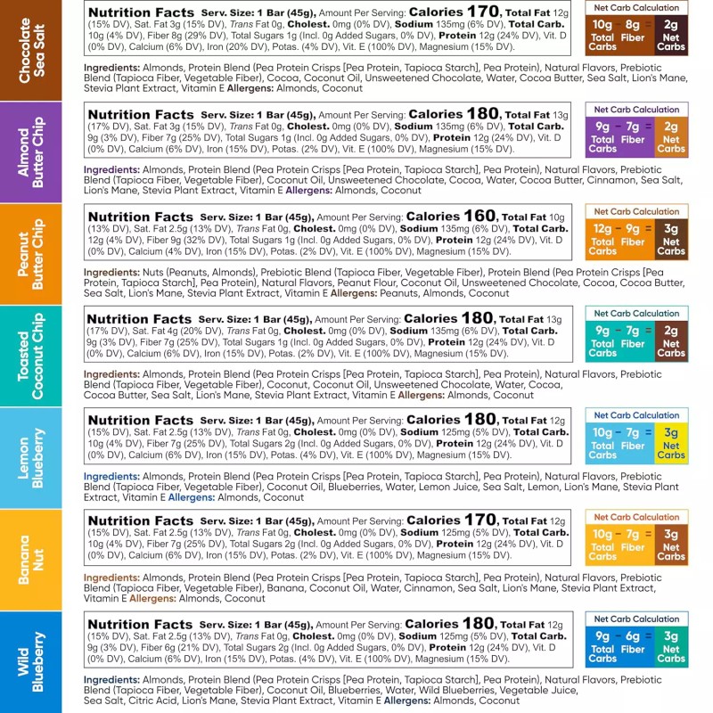 KETO FRIENDLY SNACKS w/ Only 2-3g Net Carbs in Every Serving - Net carbs are carbs that are absorbed by the body, and our keto treats come with only 2-3g of net carbs in every serving. Each keto plant based protein bar is packed with 9-12g of total carbs, 6-9g of fiber, 10-13g of fats & 160-180 calories. Try our 7 flavors Chocolate Sea Salt, Peanut Butter Chip, Almond Butter Chip, Toasted Coconut Chip, Lemon Blueberry, Banana Nut, and Wild Blueberry