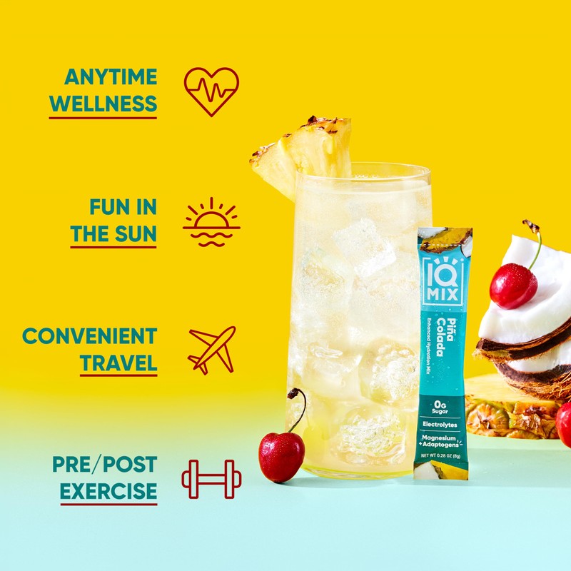 • ON-THE-GO HYDRATION: These amazing hydrate powder packets are perfect for anytime and anywhere. For best results, shake or stir IQMIX with 16oz of water until the drink mix packet is completely dissolved. Our Pi?a Colada hydration mix is a luscious blend of creamy coconut and juicy pineapple