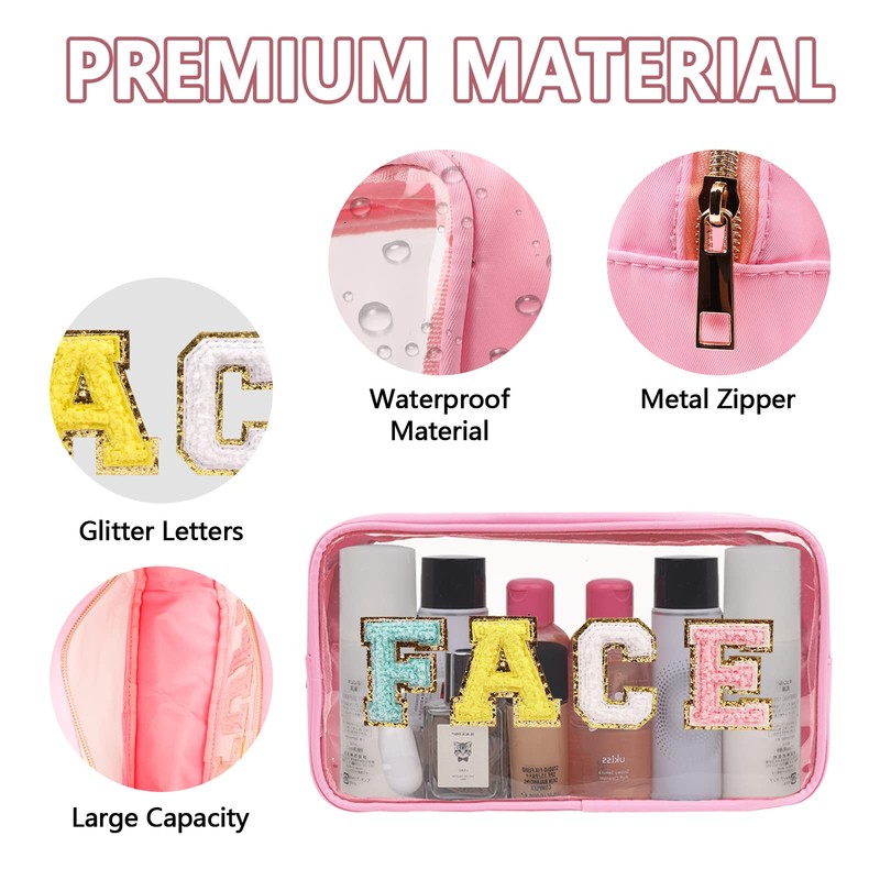 Iqimott - Bolsa de maquillaje transparente con parches de chenilla para mujer, para viajes, Pink-face