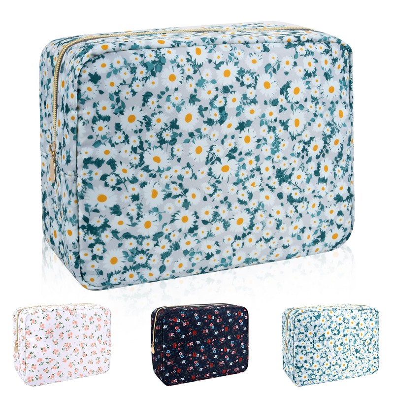 - Múltiples tamaños y flores: grande, pequeño, pequeño o delgado, ¡lo que sea! Las bolsas de maquillaje de nailon están disponibles en una variedad de flores: flor de vid, rosa, margarita, flor rosa y otras flores para que elijas.
