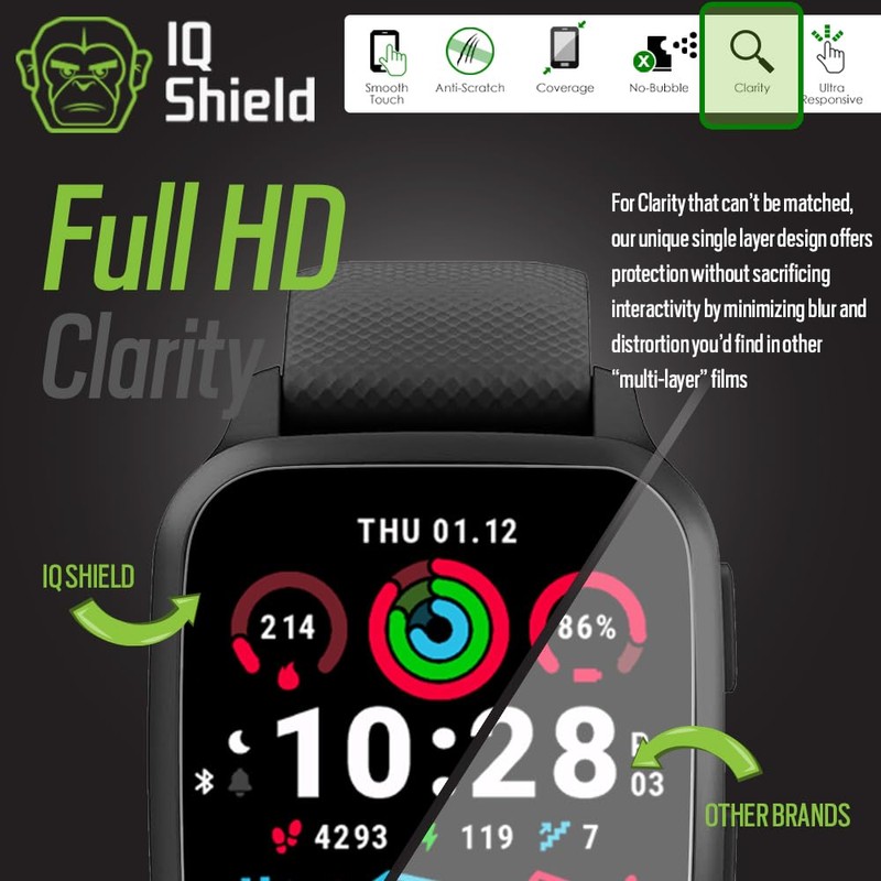 - Innovative anti-bubble IQ Shield adhesive coupled with our unique application method ensures easy installation that will leave the film perfectly contoured to any device