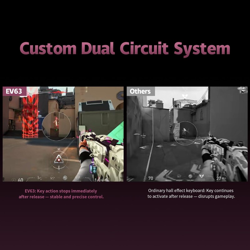 • Pro-Tuned Competitive Functions – Co-tuned with FPS pros, EV63 gaming keyboard features upgraded SOCD optimized for Valorant pros to cut input delay and boost instant stop speed. EV63 he Keyboard also supports RS, DKS, and other advanced functions for precise control in CS:GO, Valorant, and more.