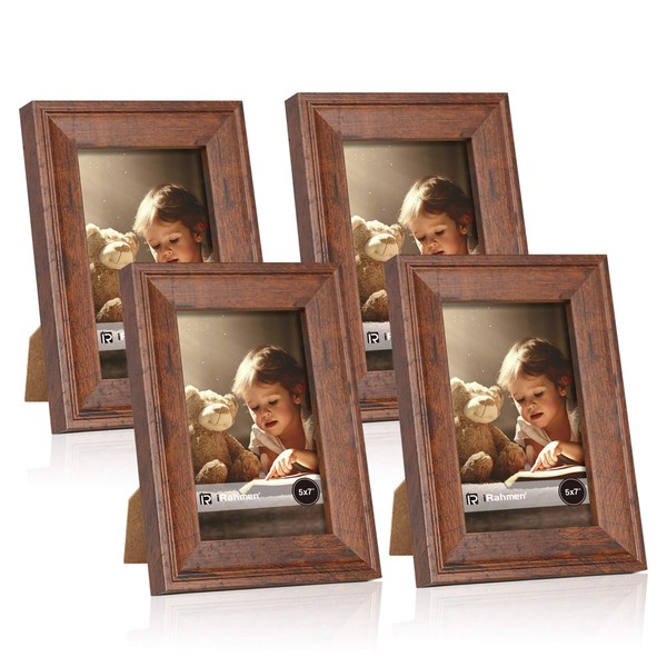 iRahmen 5x7 Picture Frames Set of 4, Wooden Photo Frame with HD Glass, Display Pictures 5 x 7 Without Mat, Rustic Picture Frames for Wall Mount and Tabletop Display Family Friends Wedding Gift