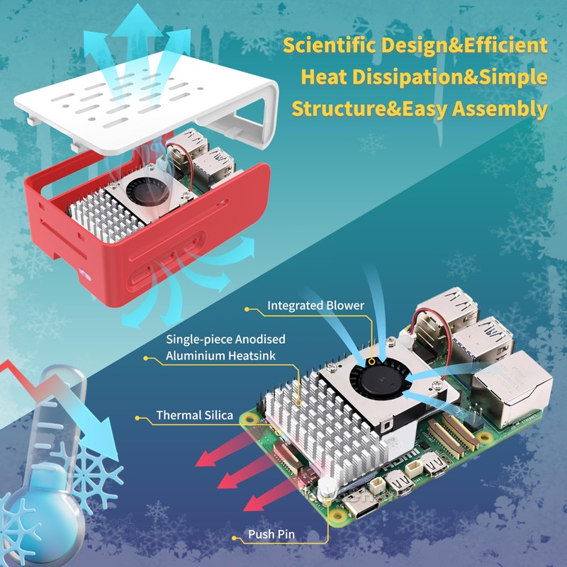 - iRasptek Active Cooler: The active cooler is composed of anodized heat-conducting aluminum with a PWM fan, which has excellent thermal conductivity and is able to quickly conduct heat away from the Raspberry Pi5 motherboard, effectively lowering the temperature and maintaining a stable operating temperature.
