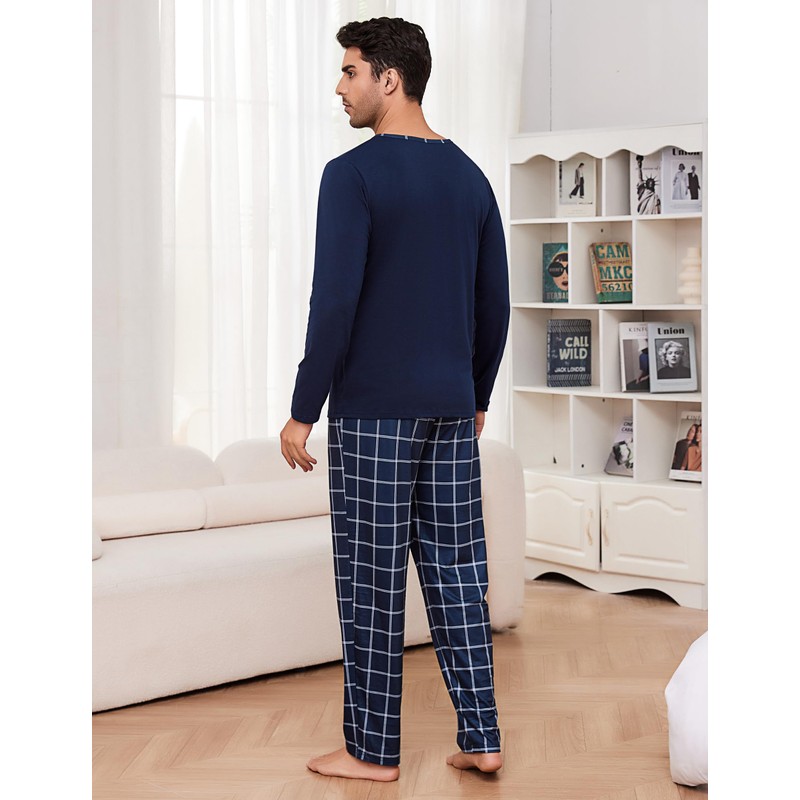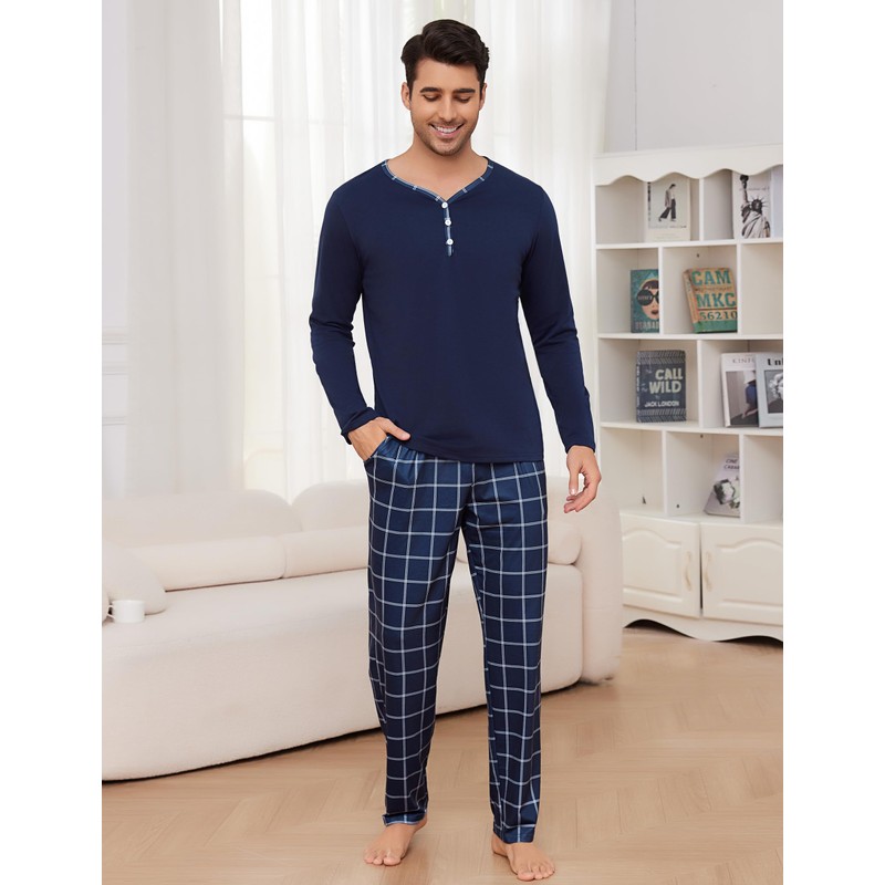 - Cosy men's pyjamas: men's long pyjamas are equipped with a V-neck that increases comfort. The long-sleeved men's T-shirt is in a simple design and has a checked fabric trim on the collar, making it classic and visually appealing. Men's long pyjamas are equipped with a button closure on the collar, which makes it easier to put on and take off and gives the men's pyjamas both style and functionality.