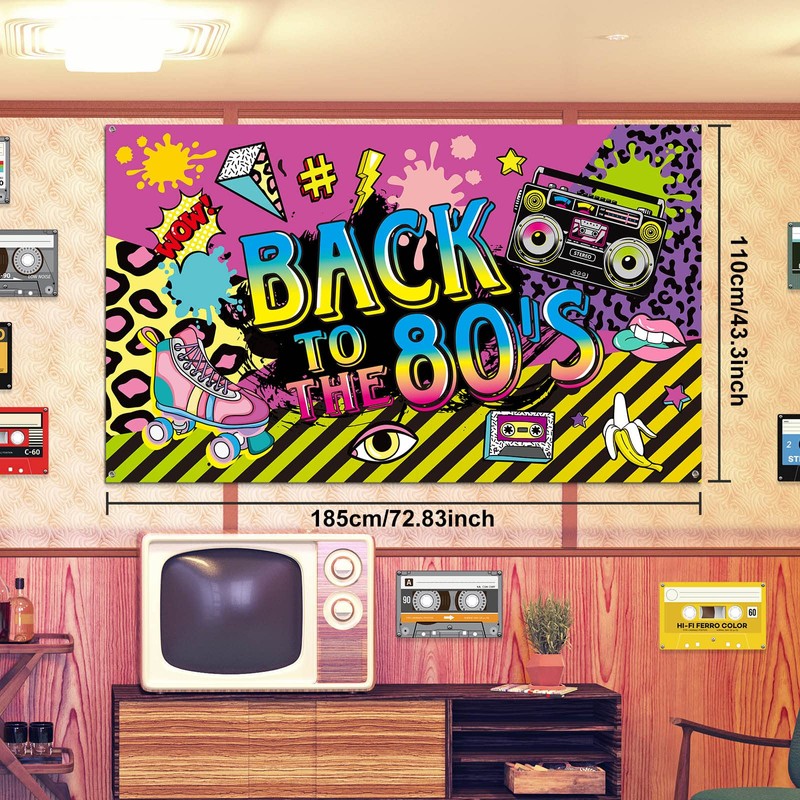 - Chic design: this 80s party decoration features a retro 80's design with neon elements, fun geometric prints and colorful text that reads "Back To THE 80's", creating a coordinated theme for 80th birthdays, theme nights and school dances