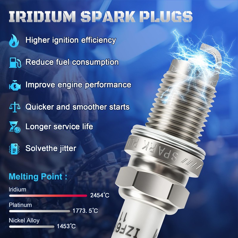 - [Premium Material]: The Iridium fine wire center electrode's durability is six times harder than platinum. Iridium alloy has extremely high melting point, giving it high durability to heat and electrical wear, Ideal for today's high performance engines