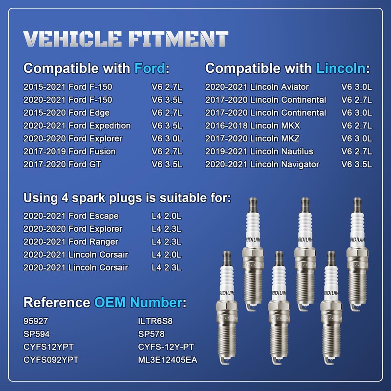 - [Vehicle Fitment]: This automotive replacement spark plugs fits for Ford F150 & Edge V6 2.7 2015 2016 2017 2018 2019 2020 2021, F150 & Expedition V6 3.5L 2020 2021, Fusion V6 2.7L 2017-2019 | Lincoln Continental V6 2.7L 3.0L 2017-2020, MKX V6 2.7L 2016 2017 2018, Navigator V6 3.5L 2020-2021, Aviator V6 3.0L 2020-2021 & More, Note: If you use 4 spark plugs, they are also compatible with 2020-2021 Ford Escape L4 2.0L & Explorer L4 2.3L & Ranger L4 2.3L & Lincoln Corsair L4 2.0L 2.3L