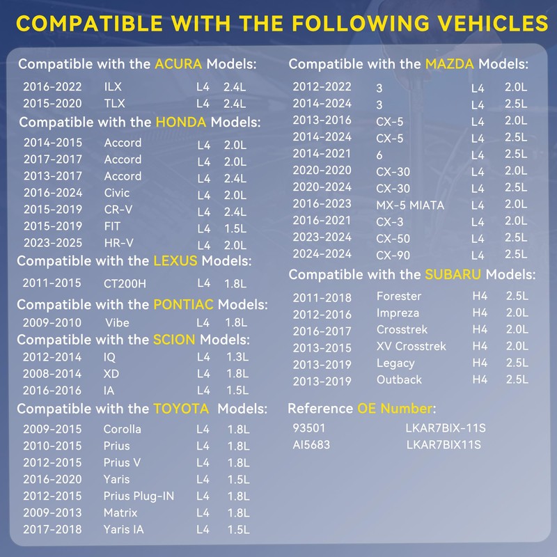 - 【Vehicle Fitment 1】 Compatible with Acura 2016-2022 ILX L4 2.4L,2015-2020 TLX L4 2.4L;Compatible with Honda 2014-2015 Accord L4 2.0L, 2017-2017 Accord L4 2.0L,2013-2017 Accord L4 2.4L,2016-2024 Civic L4 2.0L, 2015-2019 CR-V L4 2.4L,2015-2019 FIT L4 1.5L,2023-2025 HR-V L4 2.0L;Compatible with Le xus 2011-2015 CT200H L4 1.8L;Compatible with 2012-2022 3 L4 2.0L, 2014-2024 3 L4 2.5L,2013-2016 CX-5 L4 2.0L,2014-2024 CX-5 L4 2.5L,2014-2021 6 L4 2.5L, 2020-2020 CX-30 L4 2.0L,2020-2024 CX-30 L4 2.5L,2016-2023 MX-5 MIATA L4 2.0L, 2016-2021 CX-3 L4 2.0L, 2023-2024 CX-50 L4 2.5L,2024-2024 CX-90 L4 2.5L.