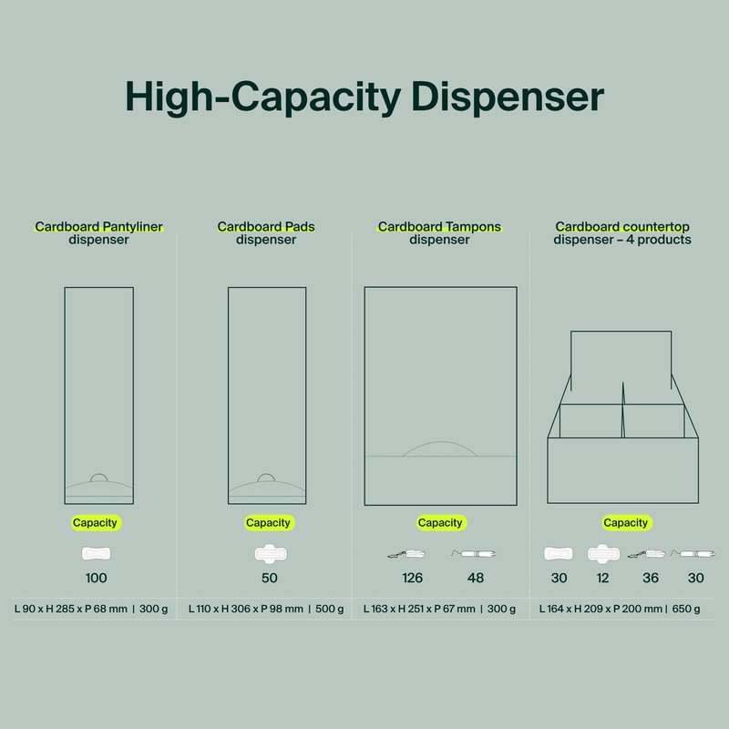 • PICK YOUR PRODUCTS - Whether you want to offer pads or tampons, our cardboard dispensers can be easily hung on the wall thanks to 3M Velcro strips. This lightweight portable solution is ideal for temporary setups or pilot projects before getting more durable options. Please note that menstrual products are included.